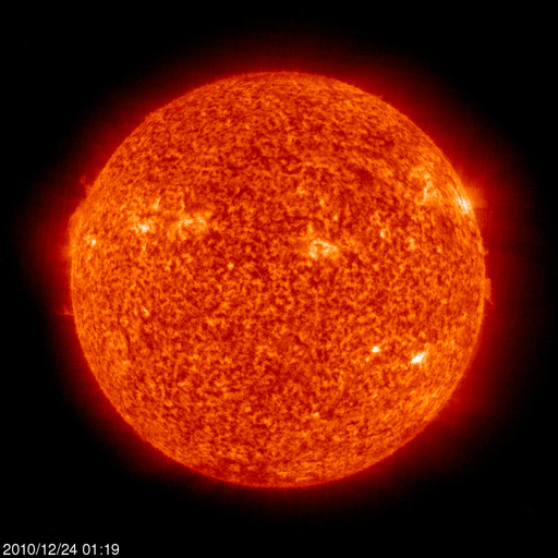 As this bulletin is being written early Thursday, December 23, there may be a spot emerging right in the center of our Sun, when viewed from Earth. It is visible as a white area when viewing the image from the STEREO mission, although this image just shows magnetically active areas in a lighter shade, which does not always correspond to areas with sunspots. Viewing the rest of the image out to the eastern horizon (left side, on solar images) shows no dramatic activity. Unfortunately, the Solar Dynamics Observatory Joint Science Operations Center has experienced a disk controller failure, and until it can be replaced, the latest image they have is from December 19. There is a recent H-Alpha image here.