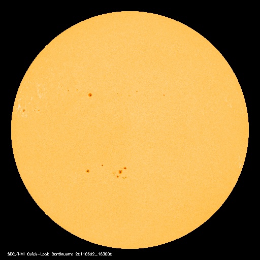 With the passing of May, we can look at some moving averages of sunspot numbers. The average daily sunspot number for the latest three month period -- March through May, centered on April -- was 74.4. The three month moving averages centered on May 2010-April 2011 were 16.4, 20.4, 23.2, 28.9, 33, 35.6, 31, 30.1, 35.3, 55.7, 72.3 and 74.4. The average sunspot number for May was 61.5, down somewhat from March and April. The monthly averages of daily sunspot numbers for January through May 2011 were 32.3, 53.5, 81.1, 80.8 and 61.5. Currently there are eight sunspot groups visible. Click here for a daily sunspot update.
