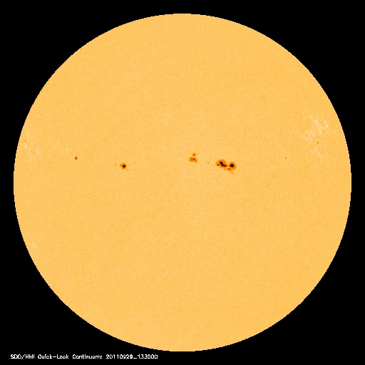 A huge sunspot group numbered 1302 emerged on September 22. This was the source of a coronal mass ejection that triggered an immense geomagnetic storm. The planetary A index peaked at 67 on September 26, followed by 30 the next day and 24 on September 28. The planetary K index reached 8 for two of the three-hour reporting periods on September 26, indicating an intense geomagnetic storm. The resulting aurora was observed in many places, including Maine, Massachusetts, Michigan, Minnesota, New York, North Dakota and South Dakota. On September 22, there was a major X1.4 class solar flare at 1100 UTC, with a large CME, but this was when sunspot 1302 was just coming over the horizon, so it wasn’t Earth-directed. On September 24 sunspot group 1302 produced a larger X1.9 flare, and today the group is just past the point where it is directly facing Earth, but still in the middle of the visible solar disc. It could still produce more flares.