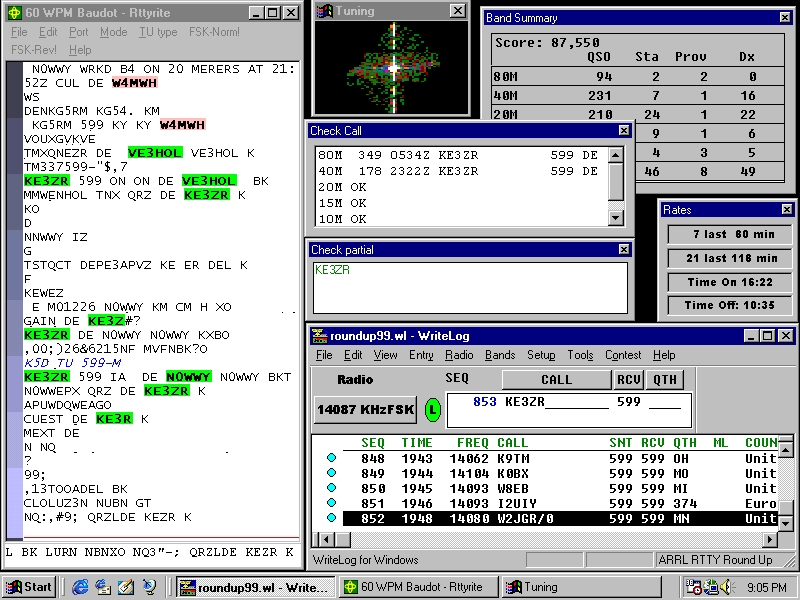 If you want the Full Monty – contest logging software with RTTY built in – there is WriteLog for Windows. You may also want to check out N1MM Logger. It has the ability to incorporate MMTTY. Both of these packages will log all your contacts and alert you if a station is a “dupe” – a duplicate contact, one you’ve already worked.