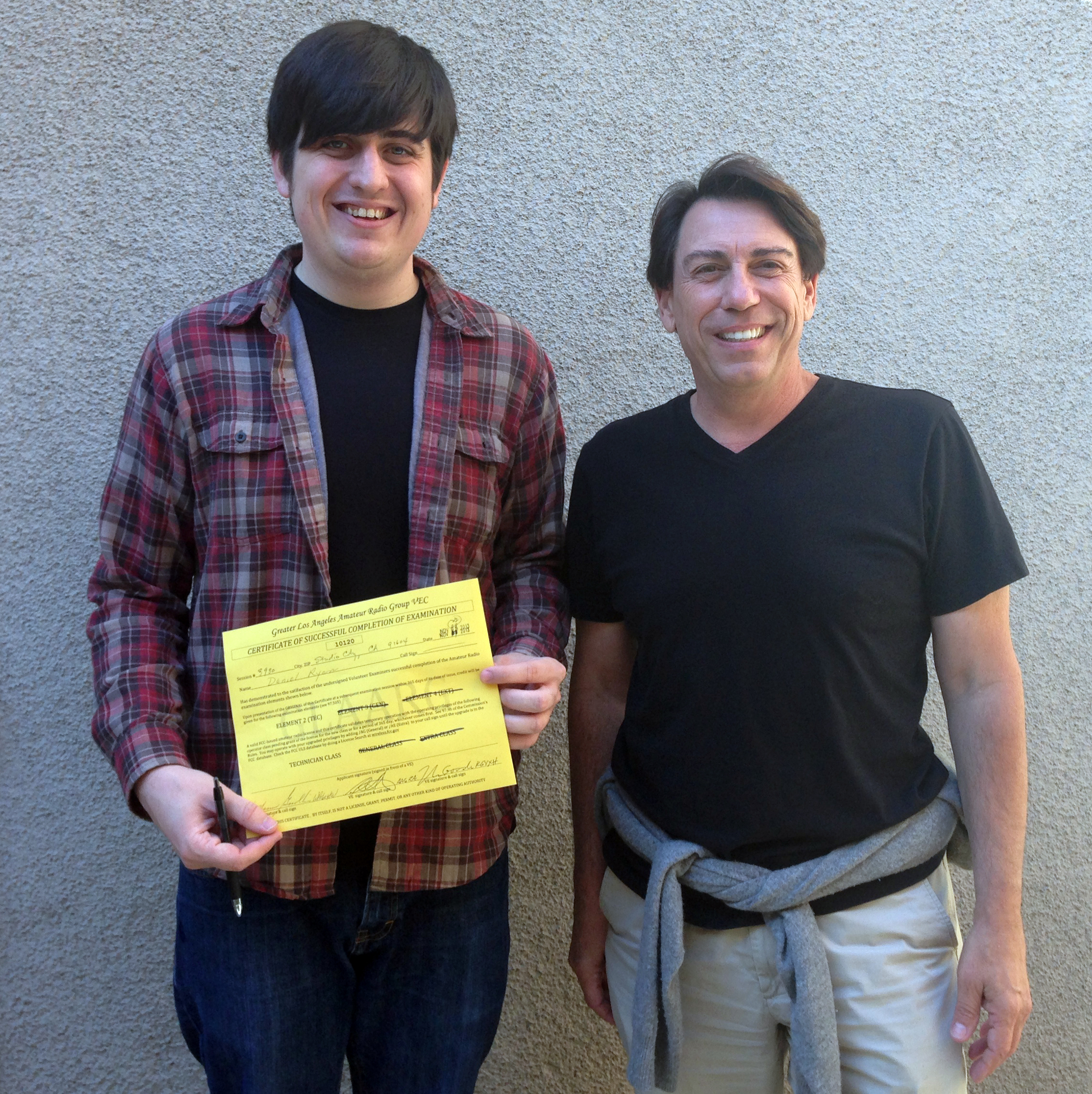 ![“Last Man Standing” crew member Daniel J. Ryan (L), holding a CSCE showing that he passed his Technician exam, poses with producer John Amodeo, NN6JA. [Photo courtesy of John Amodeo, NN6JA]](/img/130x97/exact/News/dj JA2.jpg)