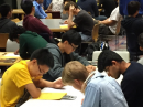 The lower-division students are primarily candidates for the Technician license and are in and out of the room within a half-hour or so. “Virtually all of them pass,” Primbsch said. “Most upper-division students at least take both the Technician and General exams, and a few opt to go all the way to Amateur Extra.”