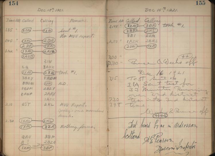 ![Researchers are seeking copies of amateur station logs from 1913-1927, in hopes they may offer insights into the relationship between individuals’ work and leisure activities, technology, and their social networks.This 1XM log from the Second Trans-Atlantic Test is signed and certified by Marconi Inspector and test referee D.E. Pearson. [Log courtesy of the MIT Radio Society]