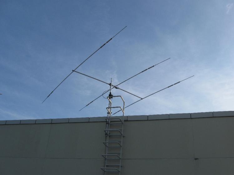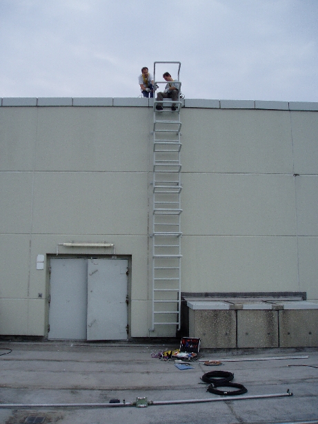 A total length of 130 meters of coaxial cable was needed. Günther and Werner really had planned every little detail. There was literally nothing they had not thought about. Adapters, tape, hardware, SWR analyzer, ropes -- all had been brought by them. Some special brackets had to be built to enable us to install the A3S on the ladder at the top of the roof.