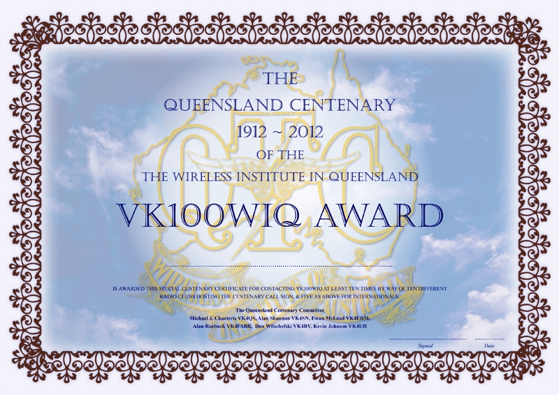 The year 2012 represents One Hundred Years of the Wireless Institute being established in the State of Queensland, Australia. To celebrate this wonderful milestone, the Queensland Advisory Committee of Wireless Institute of Australia has organized a special Centenary call sign, VK100WIQ.