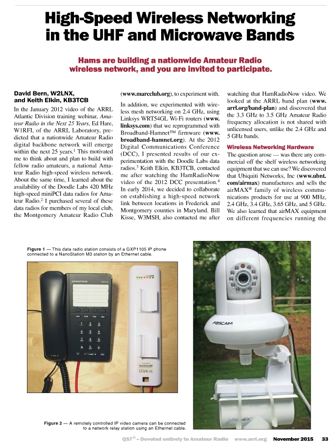 The winner of the November 2015 QST Cover Plaque award is “High-Speed Wireless Networking in the UHF and Microwave Bands” by David Bern, W2LNX and Keith Elkin, KB3TCB.