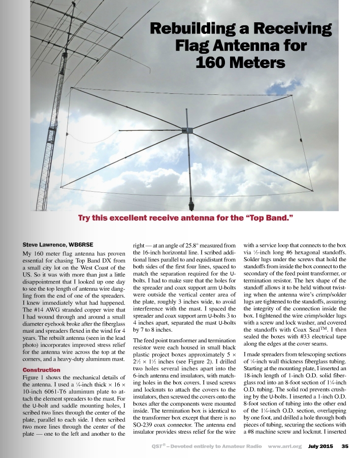 The winner of the July 2015 QST Cover Plaque award is Steve Lawrence, WB6RSE, for his article “Rebuilding a Receiving Flag Antenna for 160 Meters.”