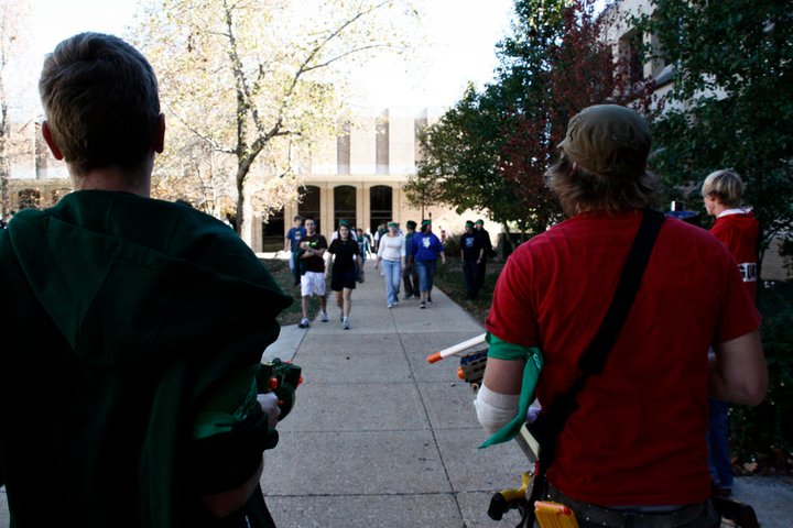 We are also planning on working with a group of people who will be playing “Humans verses Zombies,” a week-long campus-wide outdoor game of tag that’s all about survival, whether you’re a human or a zombie. In the game, everyone but one person starts as a human; you know who the humans are because they are wearing a bandanna around their arms. The one person begins his or her life as a zombie wearing a bandanna across the forehead, which must “feed,” or tag a human to stay alive. The tagged human then becomes a zombie. Throughout the week, surviving as a human becomes increasingly difficult, as zombies increase in numbers. Things such as route planning and banding with fellow humans becomes absolutely necessary to avoid being eaten! The moderators keep the game interesting by introducing missions and objectives such as locating intel or unlocking Nerf guns that allow humans to stun zombies to protect themselves.