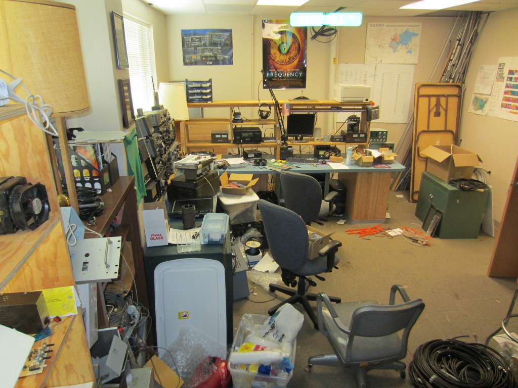 Over the summer, I completely gutted the ham shack in an attempt to get everything out of the room so we could put it all back into its proper place. We slid shelves and a fireproof file cabinet weighing almost 500 pounds against the wall. The couch slid against the back wall, and suddenly we were surprised at how much floor space was available to us. Cramped meetings are a thing of the past as we now can place a table in the middle of a room and still have seating for 10.