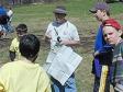 I started to develop a story line that would tie in to scouting to get the interest going. I pulled out my fox hunting gear, hung the compass around my neck, map and HT in hand (see above). It was a quick attraction. As the groups of scouts arrived I handed one of the scouts the custom antenna with a FoxFinder (see QST April 2001) attached, and started the talk with how fox hunting was like Orienteering having map and compass work with the added difficulty that you didn't know were the end point was. Since the FoxFinder is an audio signal strength indicator it was easy for the kids to swing the antenna and hear the signal change without a lot of tutoring. With one or two sweeps of the antenna virtually all of them could give a good direction. Quickly taking turns with the one-minute cycle we projected virtual bearings into the trees.